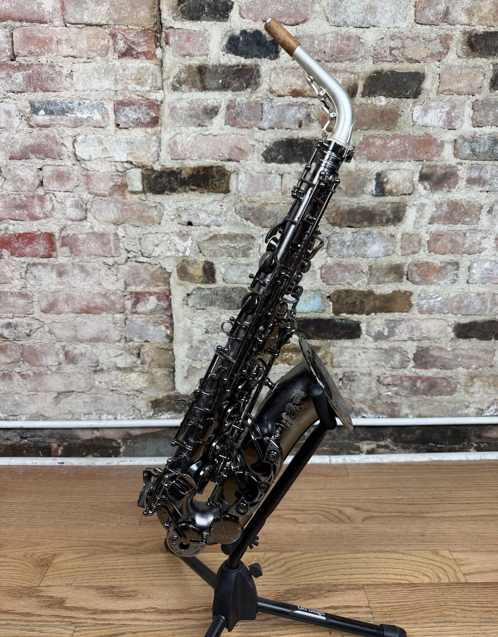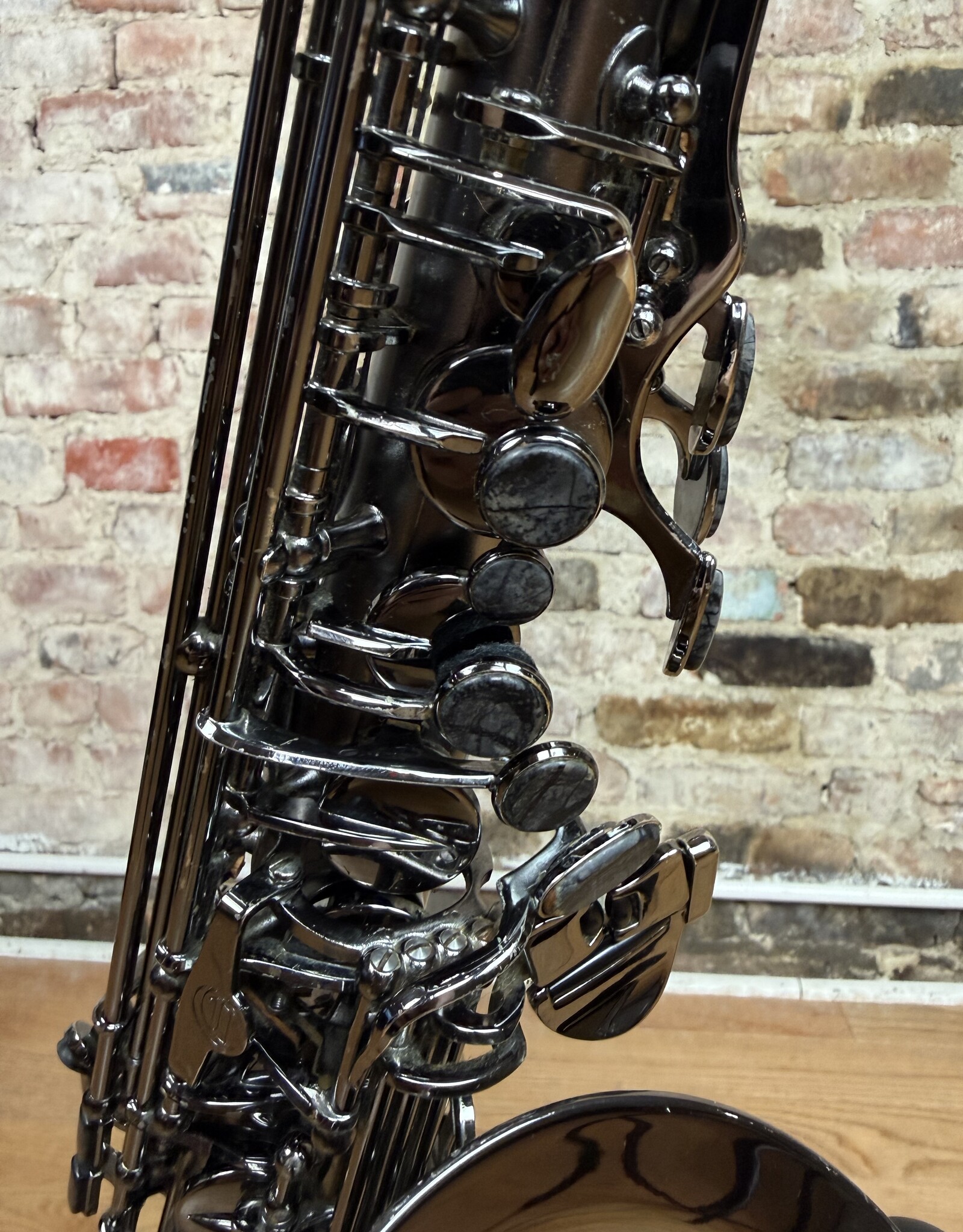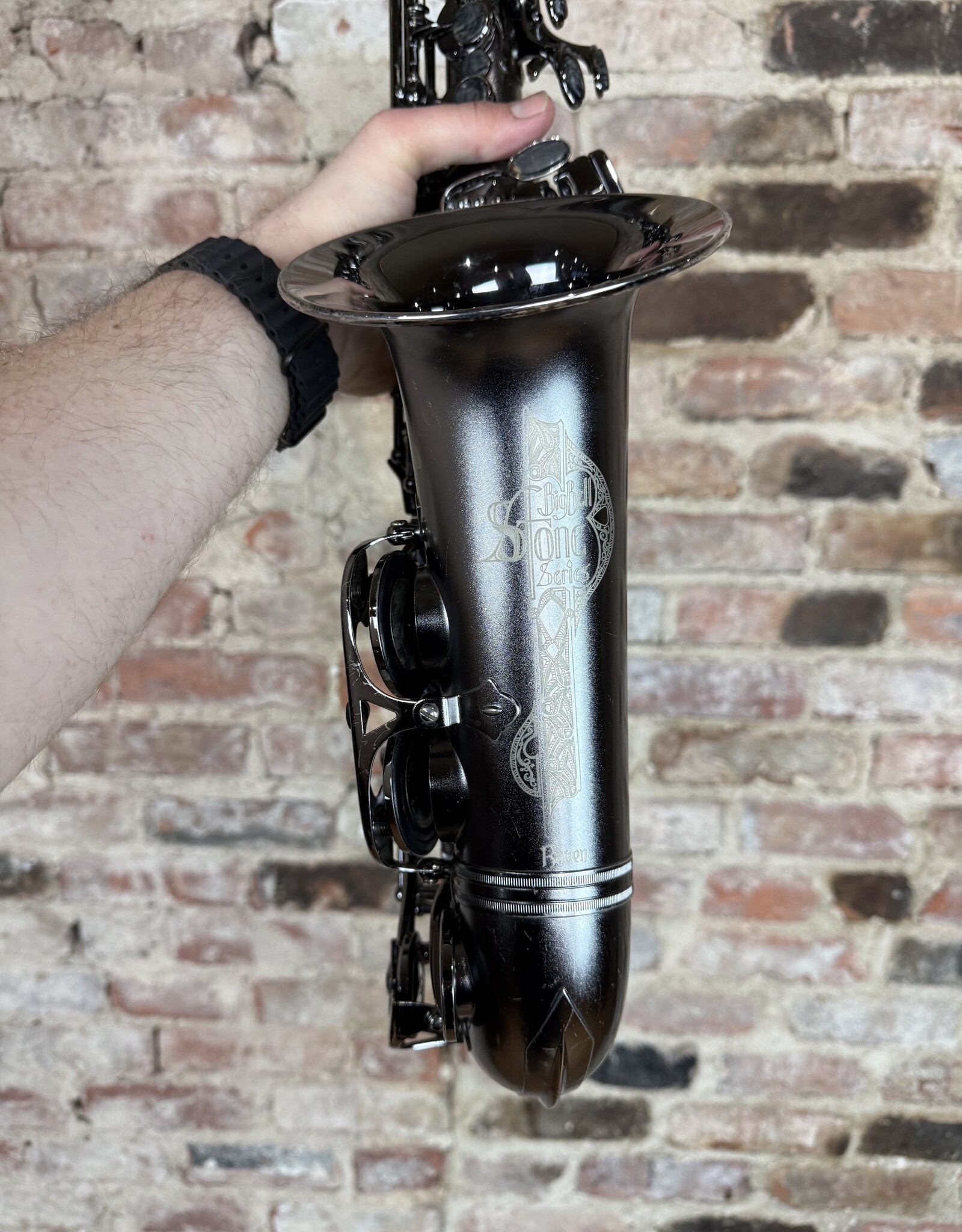 Just into our shop is this pre owned Cannonball alto! This is a Big Bell Stone Series Raven model alto in the dark nickel finish. This alto came to us with only the Fat neck option. The body is overall quite clean with minimal finish wearing or scratching. This alto received a full clean, oil, and adjust from our shop and is ready to gig on!